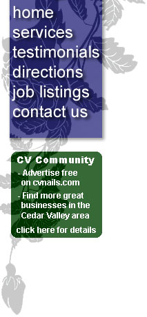 CV Nails is now closed for business. For great nails please visit our friends at Tina's Nail Spa in nearby Dripping Springs. Thank you to our customers for 8 wonderful years of business!Welcome to cvnails.com! ![]() CV Nails 3-Year Anniversary Party CV Nails celebrated its 3-year anniversary on September 1, 2007. We owe our success to our customers, and to show our gratitude we had a bit of a celebration right here at CV Nails! Click here to view the extensive photo gallery! |