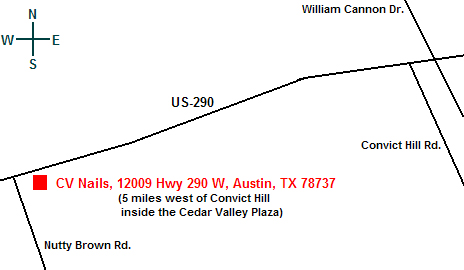 CV Nails is conveniently located in the Cedar Valley Plaza, just 5 miles west of Convict Hill Rd. A map is provided below.